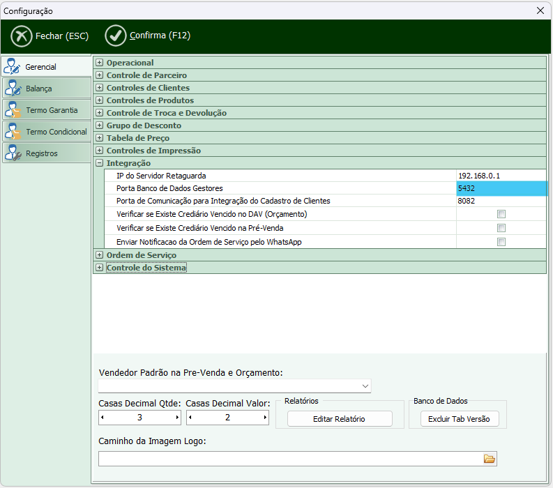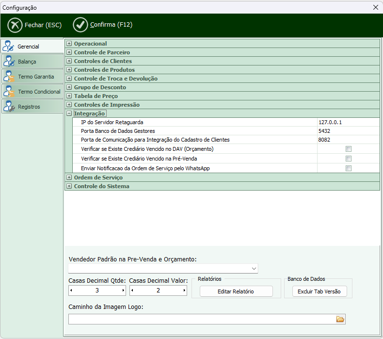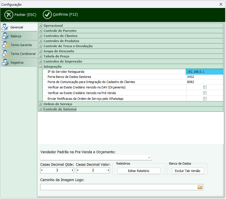 Já nas configurações do GestorBalcao em Configurações > Gerencial > Integração. Nesse campo deve ser configurado o IP onde se encontra o Gestores principal. Nesse caso não é o SincData e sim o Gestores Retaguarda. A configuração inicialmente virá com o IP 127.0.0.1 que se refere a uma conexão local.