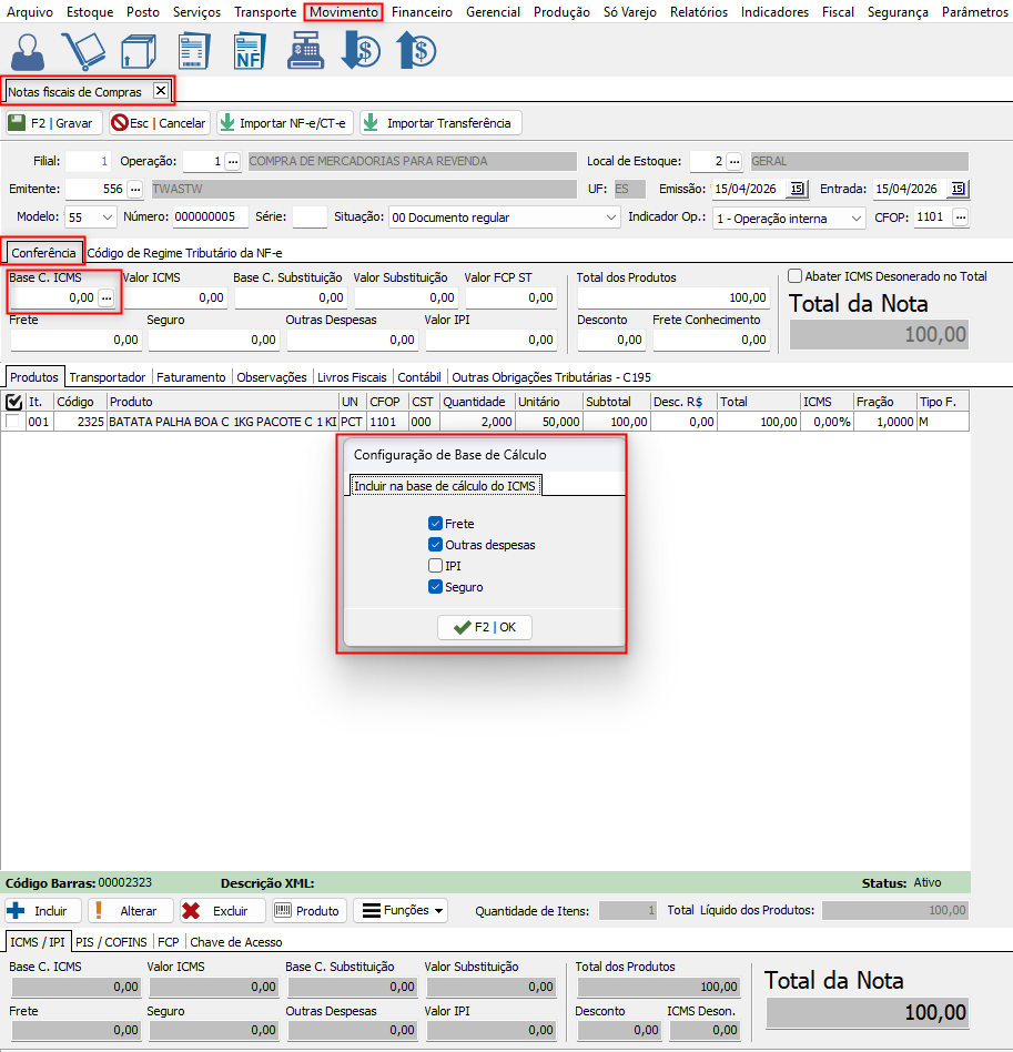 Foi adicionada a funcionalidade de marcação automática dos parâmetros da base de cálculo ao incluir uma Nota Fiscal de Compra.
