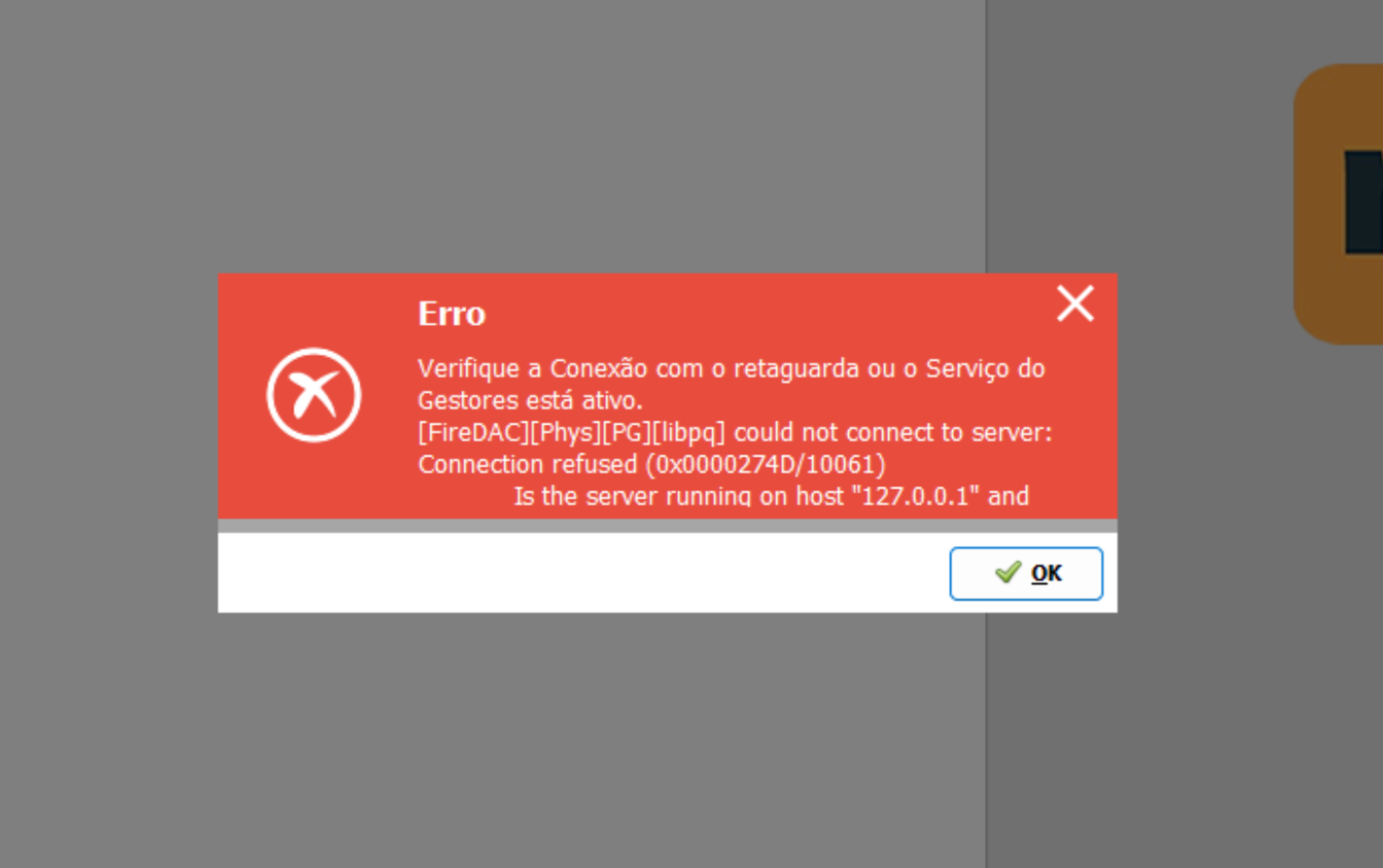 O erro é manifestado quando: Um Postgres está configurado para operar numa porta diferente da padrão (5432) e o arquivo de configuração do serviço dos gestores Servico.ini não está devidamente configurado.