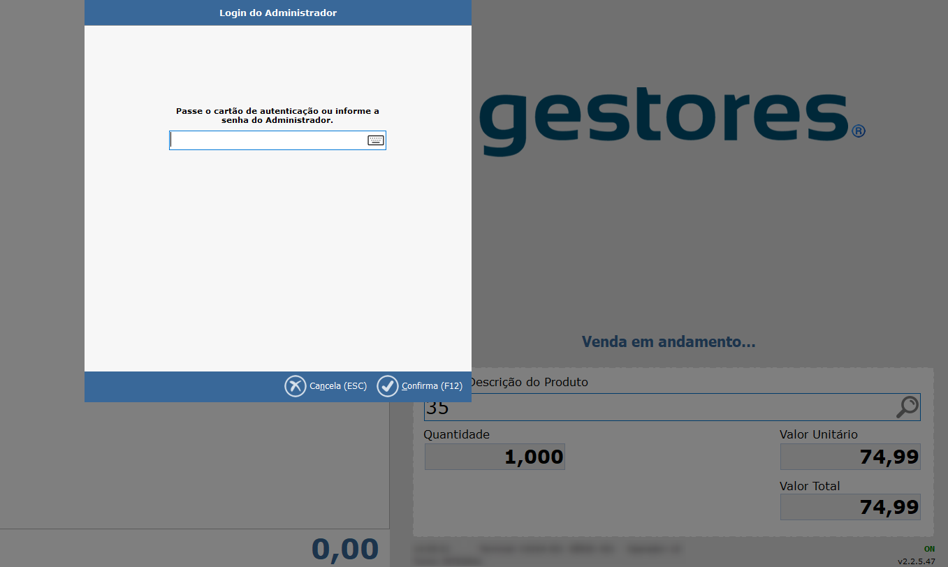 Ao pressionar CTRL + HOME e lançar o produto, o sistema exibirá a tela solicitando a senha do administrador para validar o desconto.
