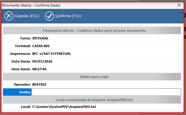 Abertura de Movimento de Turno no PDV (CTRL+I)
