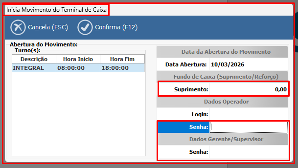 A abertura de turno deve ser realizada pelo operador de caixa ou por um usuário com permissão para operar o PDV.
