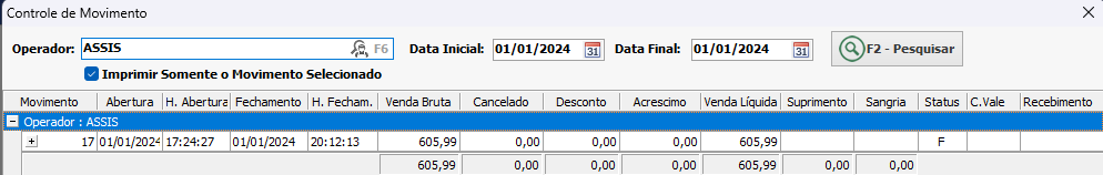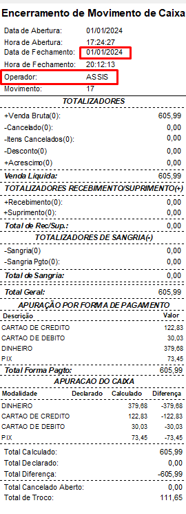 Ao imprimir o encerramento do Caixa terá a opção de imprimir somente o movimento ou operador selecionado.