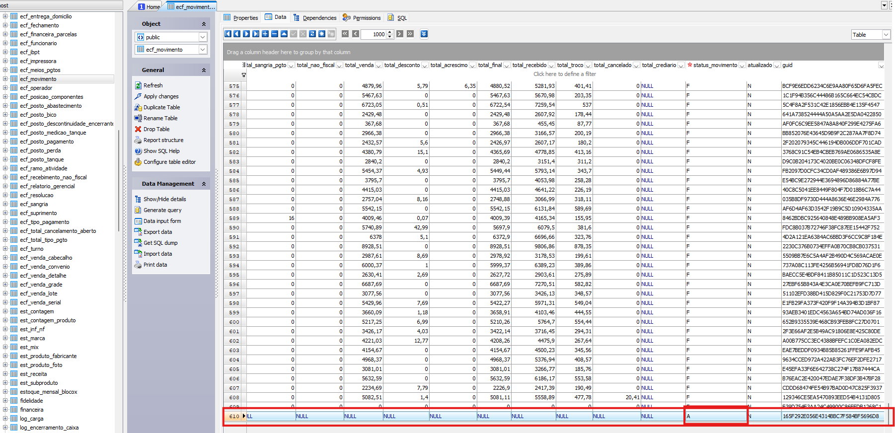 Quando ocorre o erro em questão, a venda não se apresenta no F8. Com isso, em Auditar será possível encontrar a última venda que estará zerada. Sendo assim, faz-se necessário ir no banco de dados do PDV e ir em ecf_movimento e apagar o último cupom, observe que a venda estará como Aberta (A):