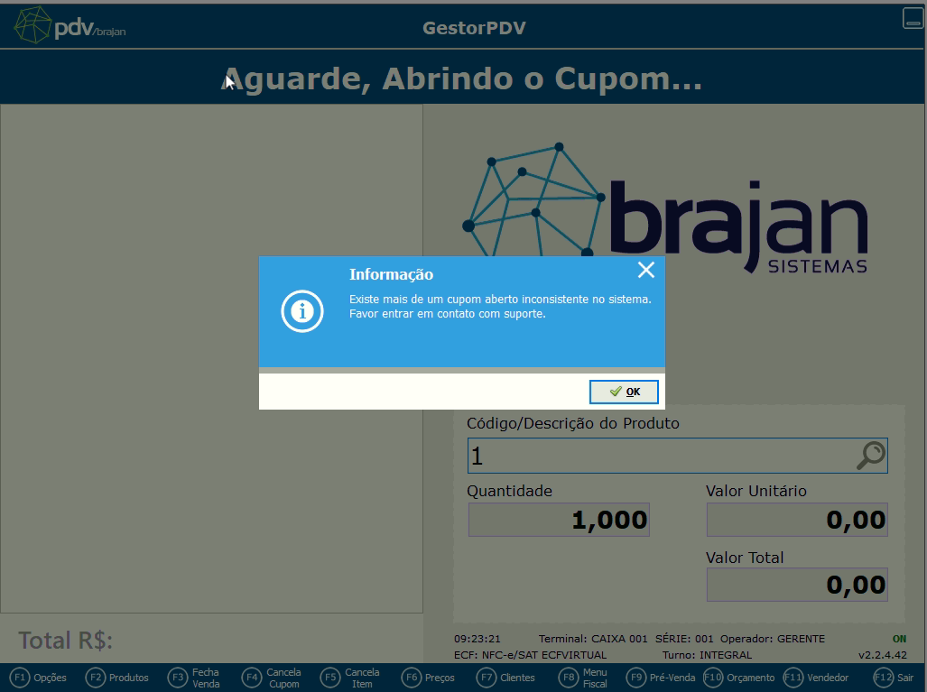 GestorPDV - Informação: Existe mais de um cupom aberto inconsistente no sistema. Favor entrar em contato com suporte.