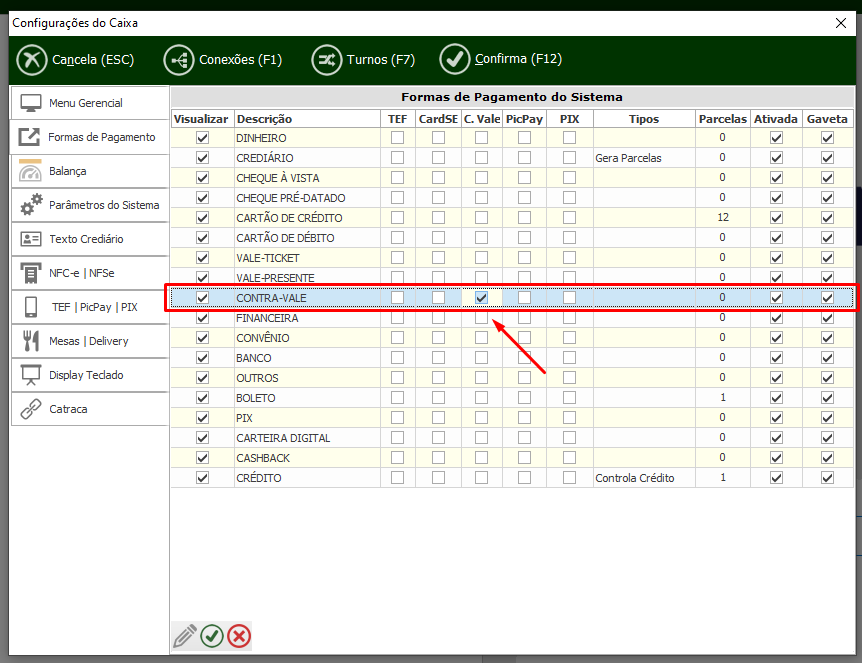 No cadastro de forma de pagamento foi criado a coluna ‘C.Vale’ que se estiver ativado em forma de pagamento no GestorPDV vai abrir a tela para baixar o valor desejado que o cliente tenha no cadastro de contra vale para que seja abatido na venda do mesmo.