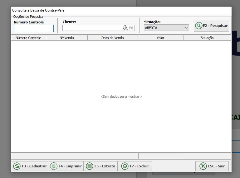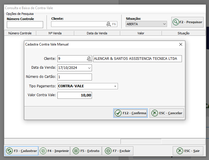 A forma manual é ativada com o atalho Alt + R ou também em Opções >> Funções >> Gerar Crédito Contra-Vale, essa função abrirá uma tela para o cadastro de contra vale, onde será necessário informar o cliente e valor.
