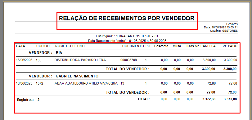 Caso o vendedor não esteja vinculado ao campo, suas informações não serão exibidas no relatório