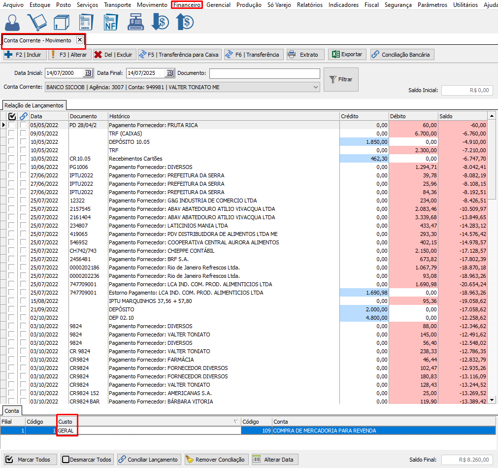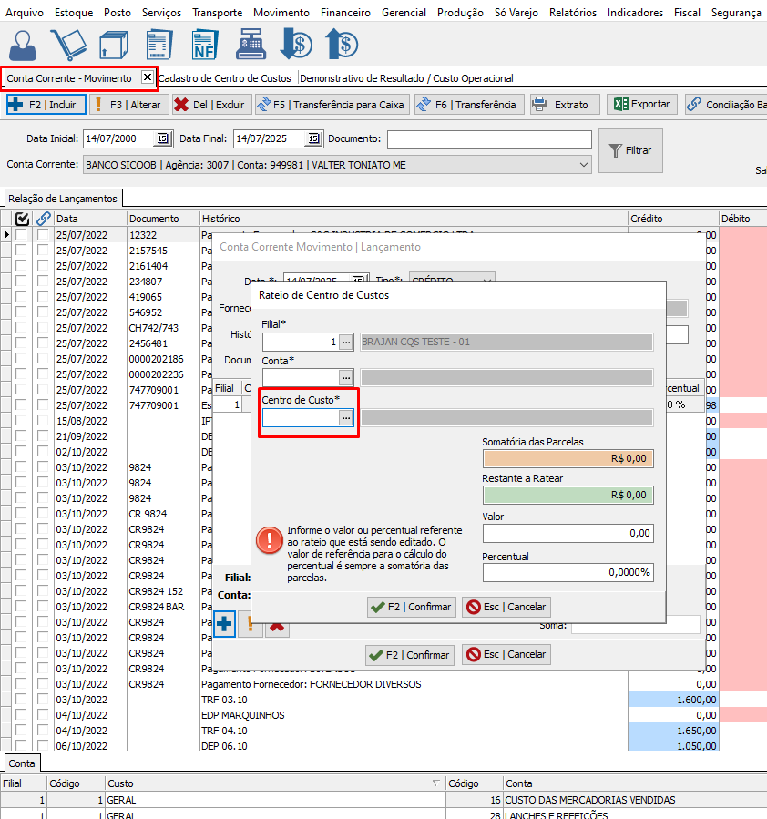 Foi adicionada, no rodapé da tela, a informação referente ao Centro de Custo das contas;
