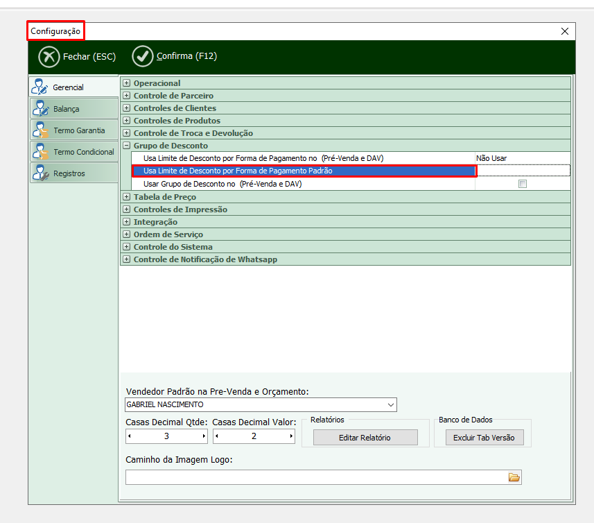 Além disso, há o parâmetro "Usa Limite de Desconto por Forma de Pagamento Padrão", onde o cliente pode definir qual será o comportamento padrão que o sistema deve adotar ao ser iniciado.