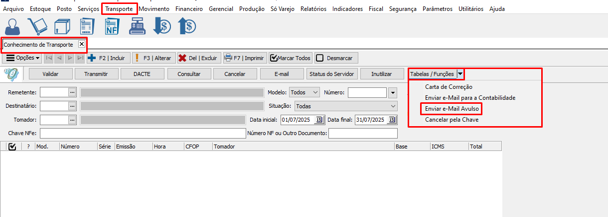 Essa opção está disponível no caminho: Conhecimento de Transporte >> Tabelas / Funções >> Enviar E-mail Avulso.
