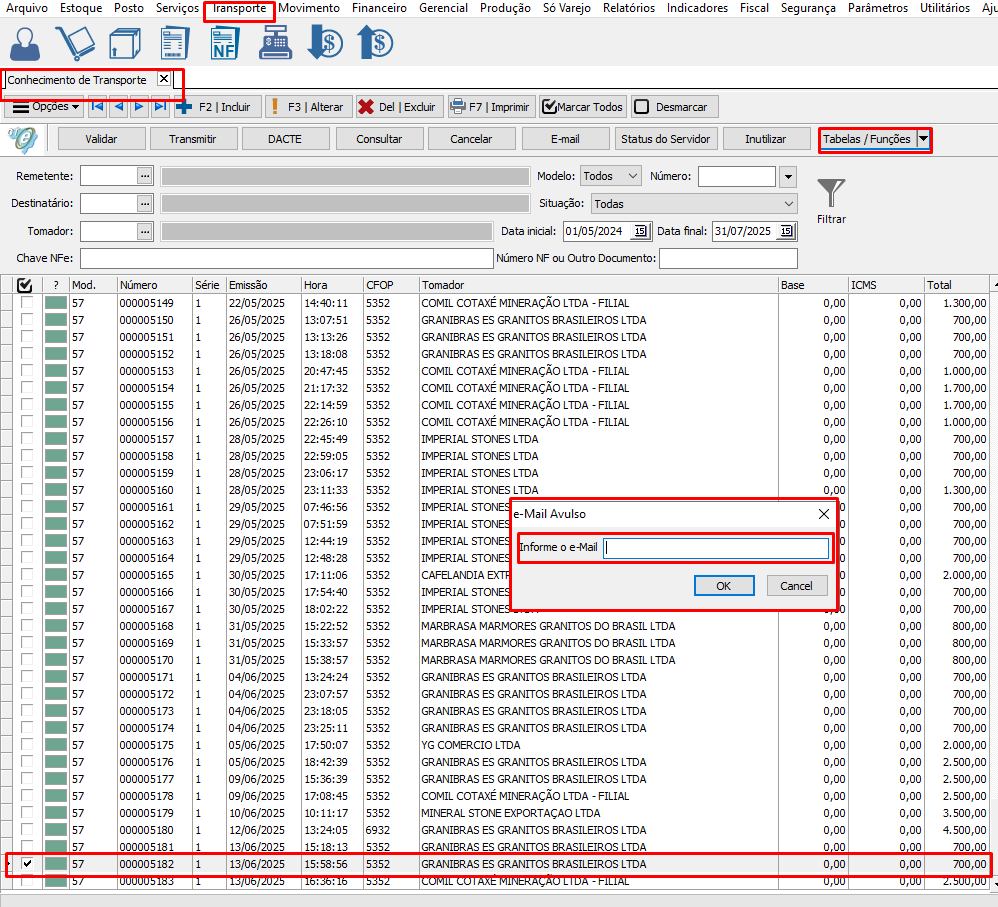 Foi implementada no módulo Gestores, na área de Conhecimento de Transporte (CT-e), a funcionalidade de envio de e-mail avulso.