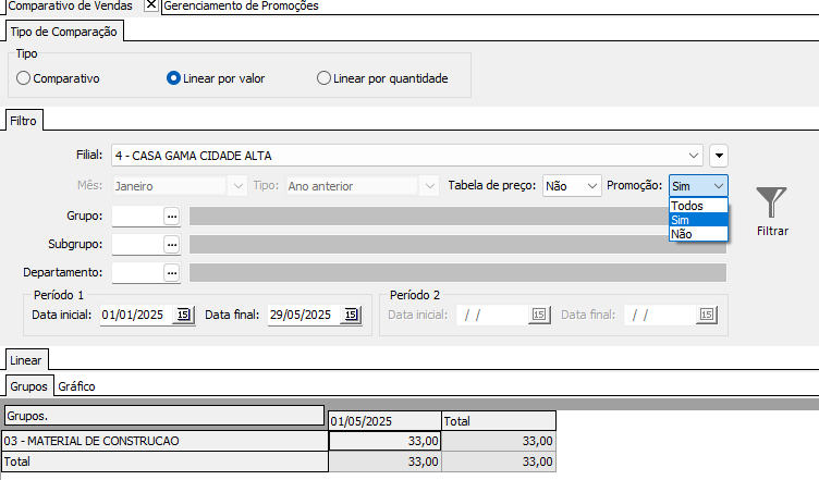 Atualmente na versão 210, o sistema não busca pelos produtos e sim pelos grupos no Comparativo de Vendas: