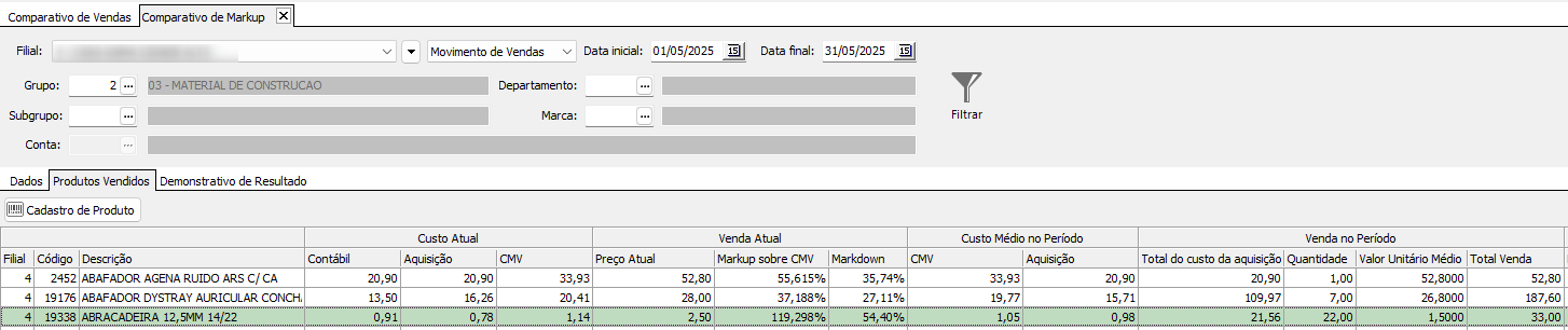 Já no Comparativo de Markup, funciona por Produtos após selecionar o grupo: