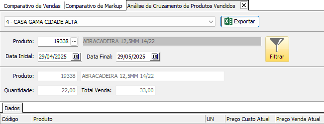 Por fim, na Análise de Cruzamento de Produtos Vendidos funciona ao filtrar o produto: