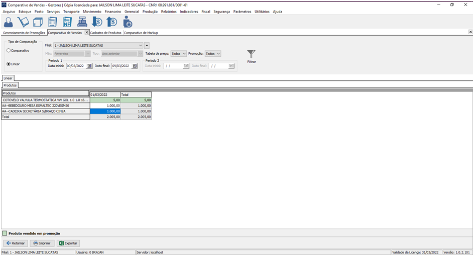 Nas seguintes telas: Comparativo de vendas, Comparativo de Markup e Análise de Cruzamento de Produtos Vendidos, foi colocado para destacar no grid o produto que foi vendido na promoção.