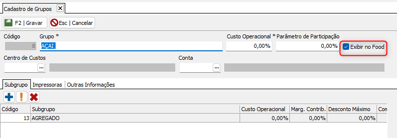 Foi implementada uma nova funcionalidade no Cadastro de Grupos: o parâmetro "Exibir no FOOD".