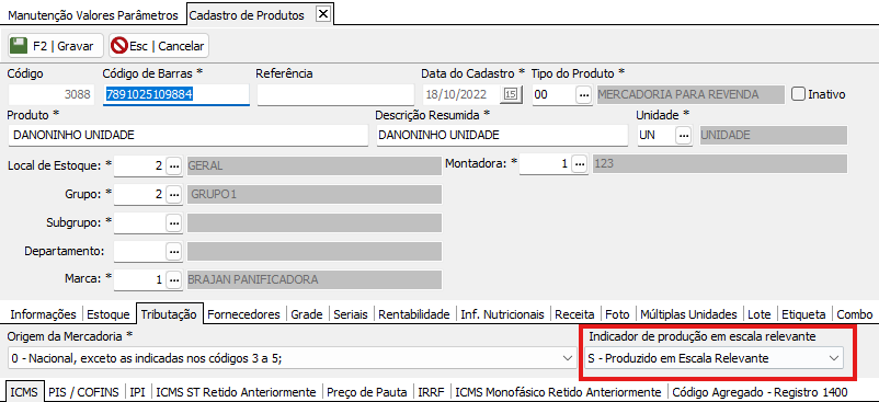 Quando o parâmetro estiver marcado como SIM, ao incluir um novo produto, o sistema definirá automaticamente o valor "SIM – Produzido em Escala Relevante" como padrão.