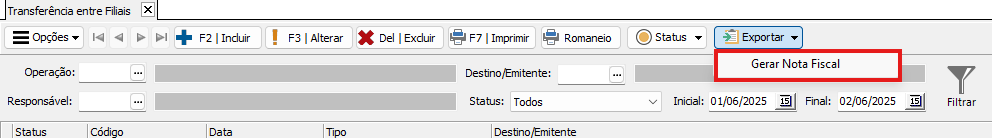 Foi adicionada à tela de Transferência entre Filiais a nova opção de gerar automaticamente a Nota Fiscal da transferência, tornando o processo mais ágil, seguro e alinhado com as obrigações fiscais.