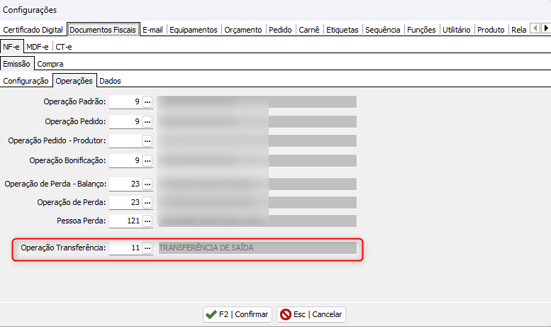 Utilitários → Configurações → Documentos Fiscais → Operações → Operação Transferência