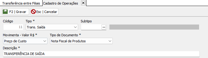 Cadastre a operação específica que será utilizada para emissão da nota fiscal de transferência.