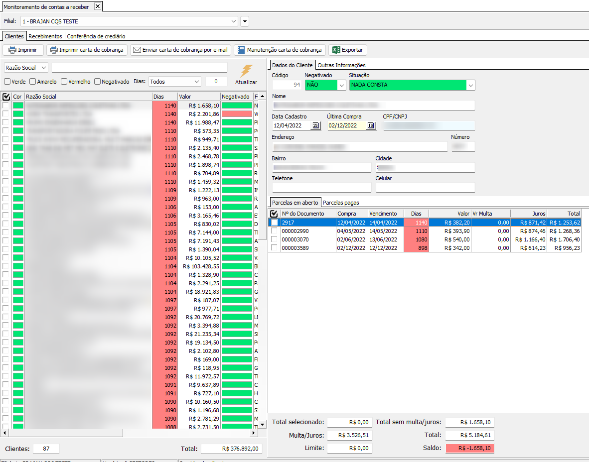 Nessa tela é possível mudar a SITUAÇÃO DO CLIENTE, consultar as parcelas