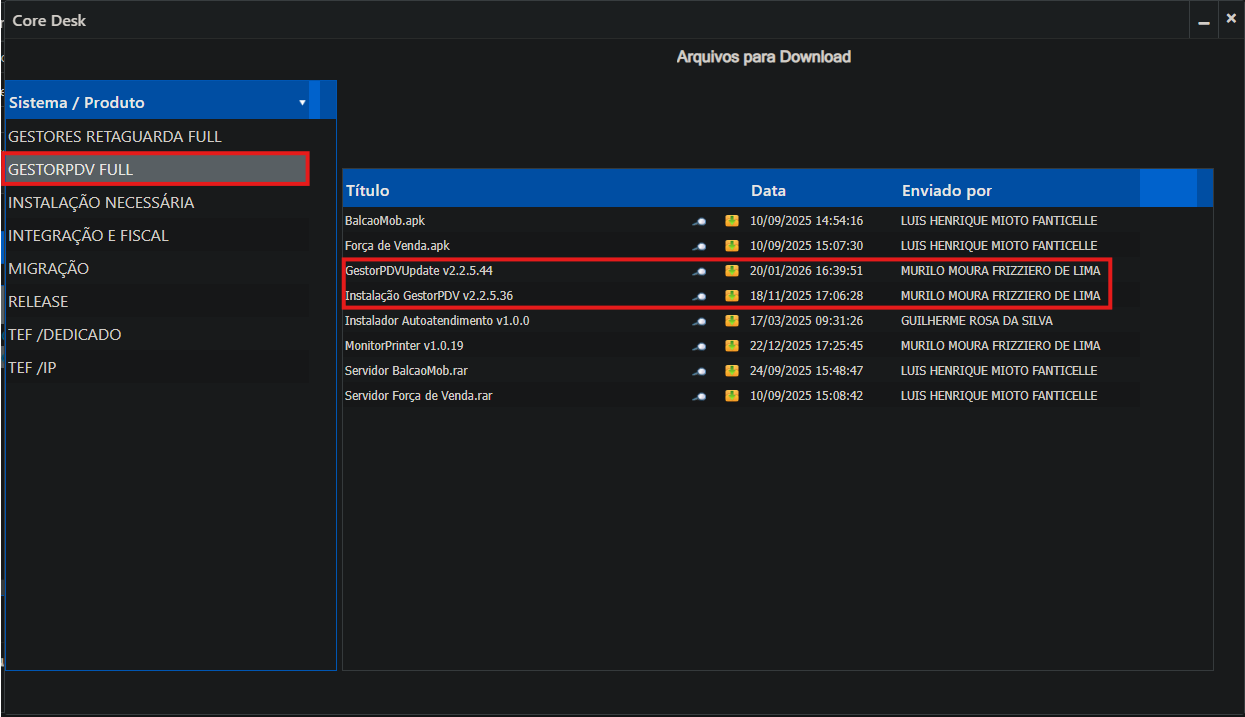 Deve-se baixar o instalador do GestorPDV e o GestorPDVUpdate(atualização)