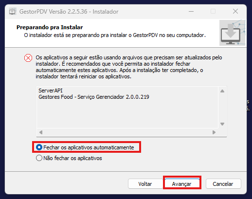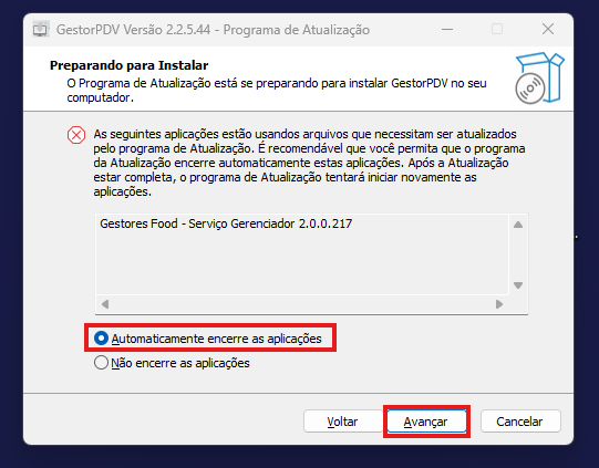 Caso apareça essa tela deixe marcado a opção "Automaticamente encerre as aplicacoes" e clique em avançar