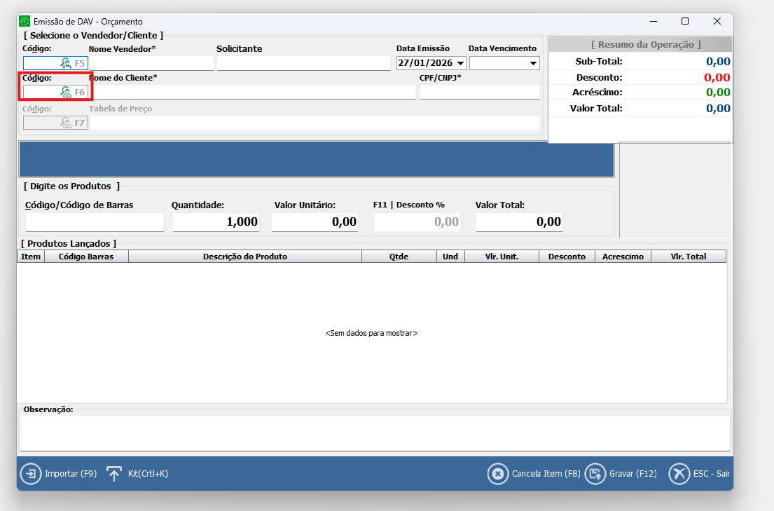 Como exemplo, será utilizado o Orçamento, porém o mesmo procedimento também pode ser realizado nas telas de Pré-Venda e Ordem de Serviço.