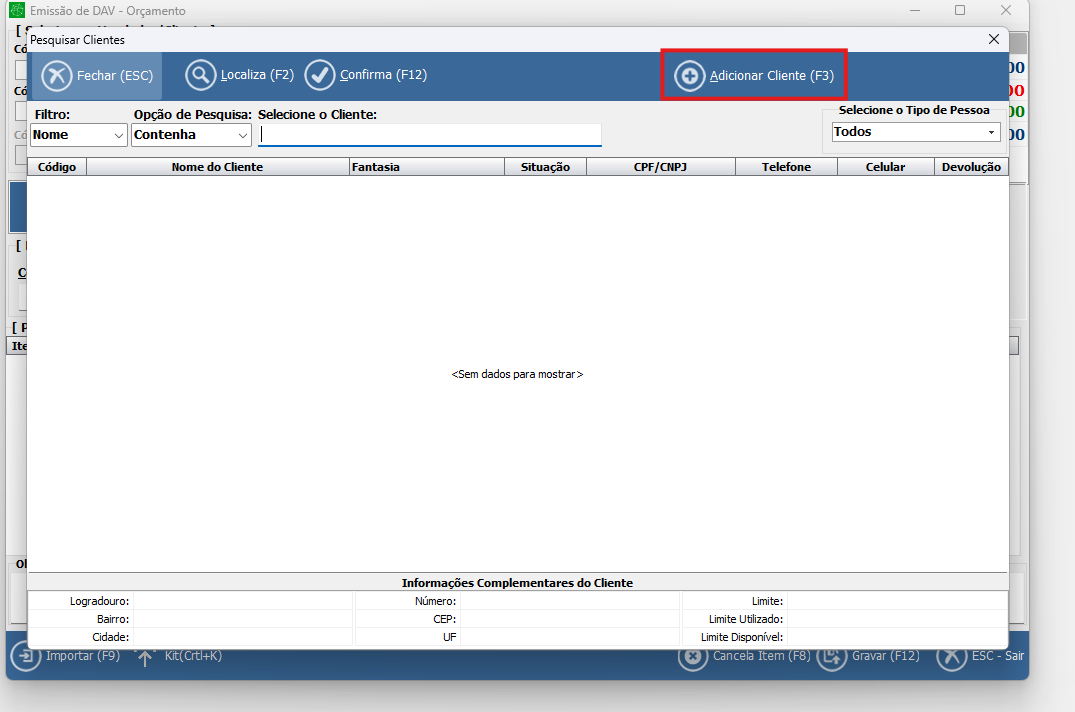 - Na tela de pesquisa de clientes, clique em “Adicionar Cliente” ou utilize o atalho F3.