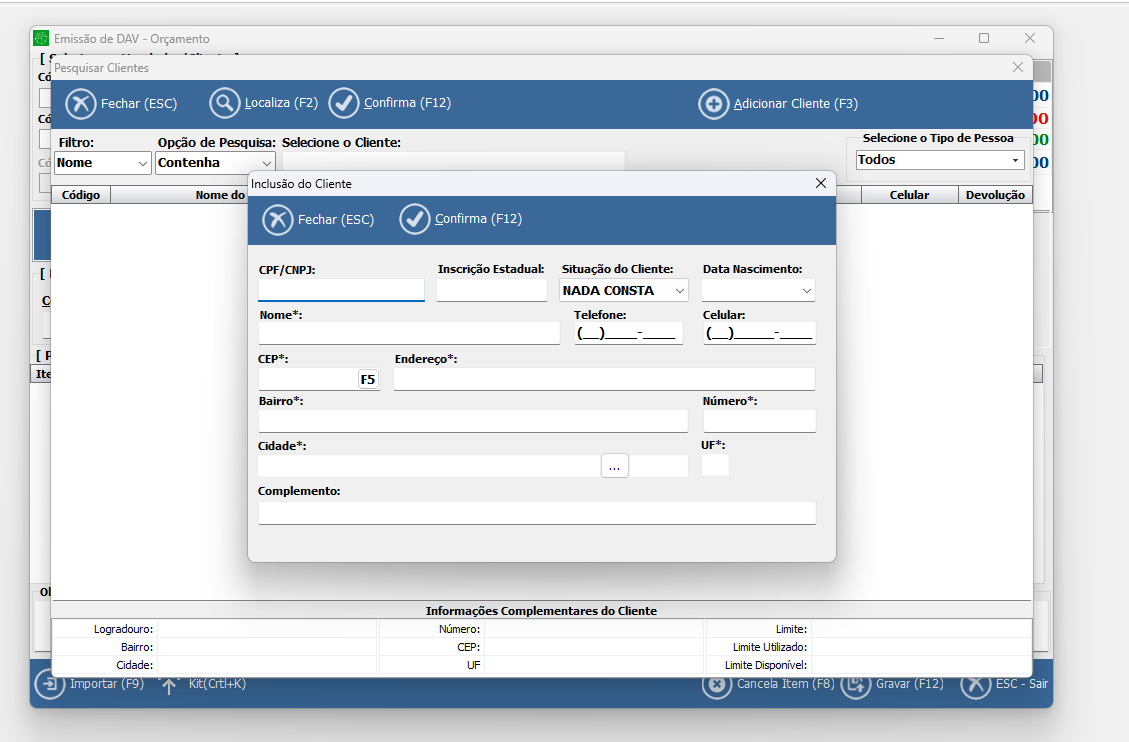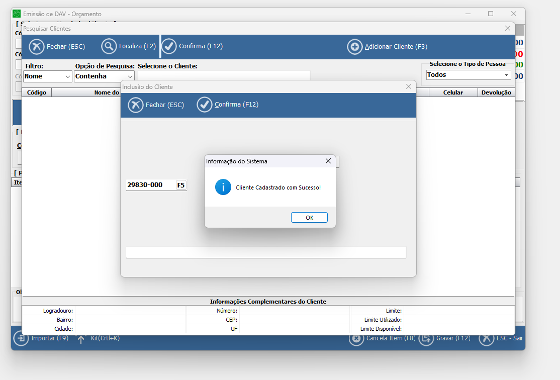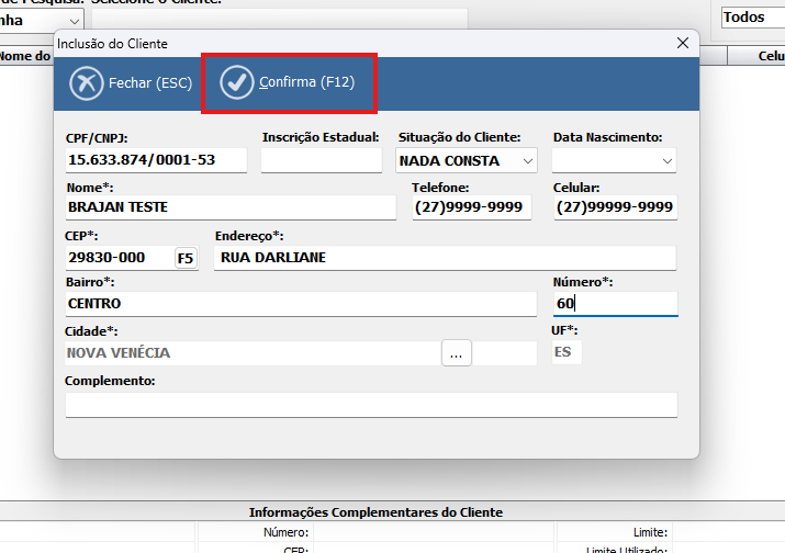 - Após preencher corretamente os dados do cliente, clique em Confirmar ou utilize o atalho F12 para finalizar o cadastro