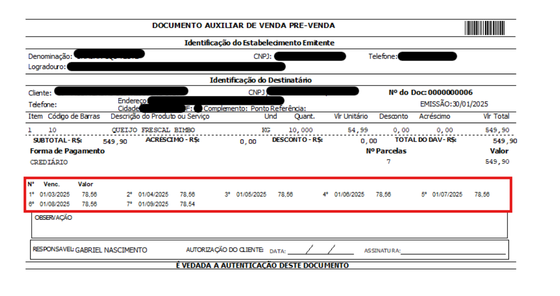 Na impressão da pré-venda, nos formatos “A4 padrão” e “folha razão”, foi realizado o reajuste da posição das parcelas, que agora passam a ser exibidas em sequência horizontal. Essa alteração tem como objetivo proporcionar uma visualização mais clara, organizada e intuitiva das informações de pagamento, facilitando a leitura e o entendimento tanto para o cliente quanto para o operador no momento da conferência.