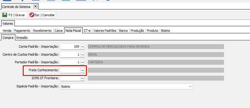 1- Para estar preenchendo a informação e necessario ir no seguinte caminho: Parâmetros >Controle do sistema>Nota Fiscal>Compra e no campo 'FRETE CONHECIMENTO' e preenche com a informação correta.