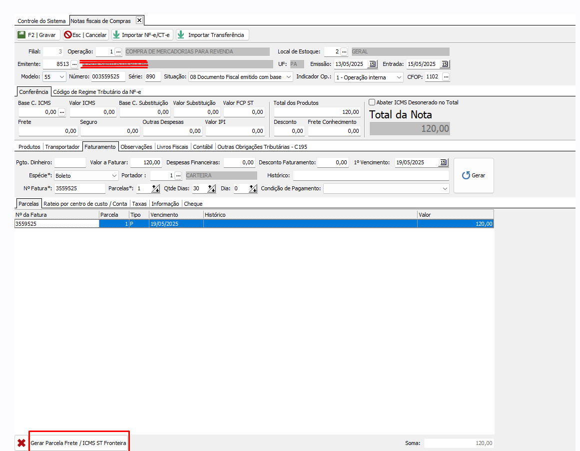 2- Nas notas fiscais de COMPRA>FATURAMENTO foi criado o campo Gerar parcela frete / ICMS ST Fronteira, onde o mesmo irá pegar o valor do frete no campo Frete Conhecimento e ICMS ST Fronteira dos itens da nota fiscal