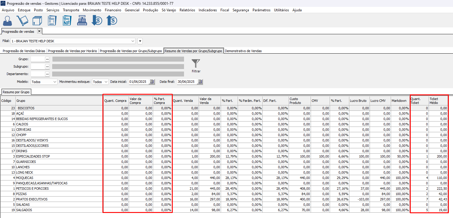 Em Gerencial>Progressão de vendas> Resumo de vendas por GRUPO/SUBGRUPO, foram adicionados os seguintes campos: Quantidade de compra, Valor de compra (valor unitario), %Participação de compra, Quantidade Ticket, Ticket medio.