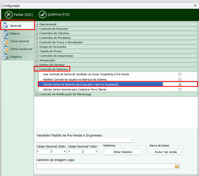 Dentro das configurações do sistema no balcão,foi introduzido um novo parâmetro chamado 'Solicitar Senha do Gerente para Cancelar Itens no Orçamento'. Ao ativar este parâmetro, o sistema exigirá a senha do gerente para cancelar qualquer item no orçamento."