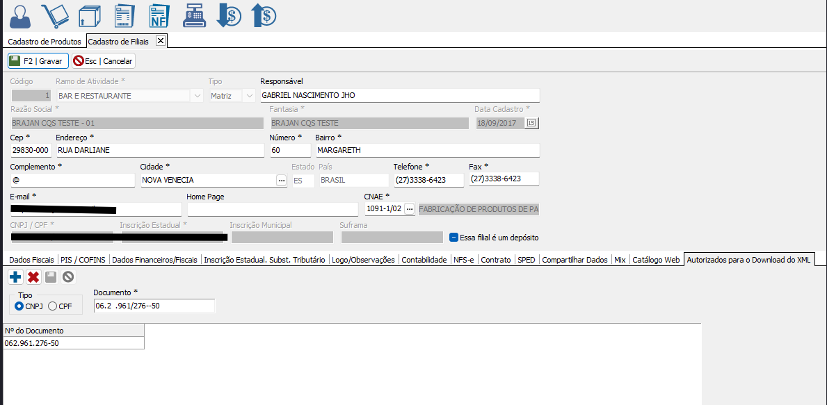 Foi adicionada uma nova aba no cadastro de Filiais chamada "Autorizados para Download do XML". As informações cadastradas nesse campo serão aplicadas como padrão em todas as notas fiscais emitidas