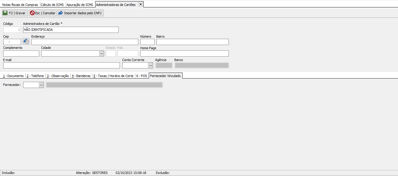 Analisando isto vemos que este erro reflete no cadastro de administradora de cartões efetuado em nosso gestores. Então para corrigirmos esta questão precisa-se estar corrigindo e realizando o cadastro correto desta operadora.