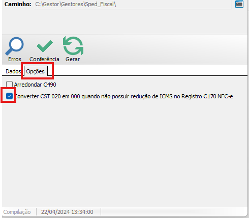 PARA REALIZAR A CORREÇÃO DAS ADVERTÊNCIAS ACIMA FAZ-SE NECESSÁRIO MARCAR O CHECKBOX ABAIXO, ANTES DE GERAR O SPED: