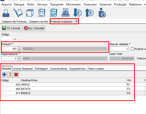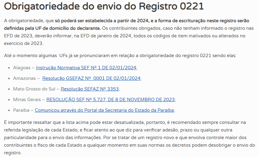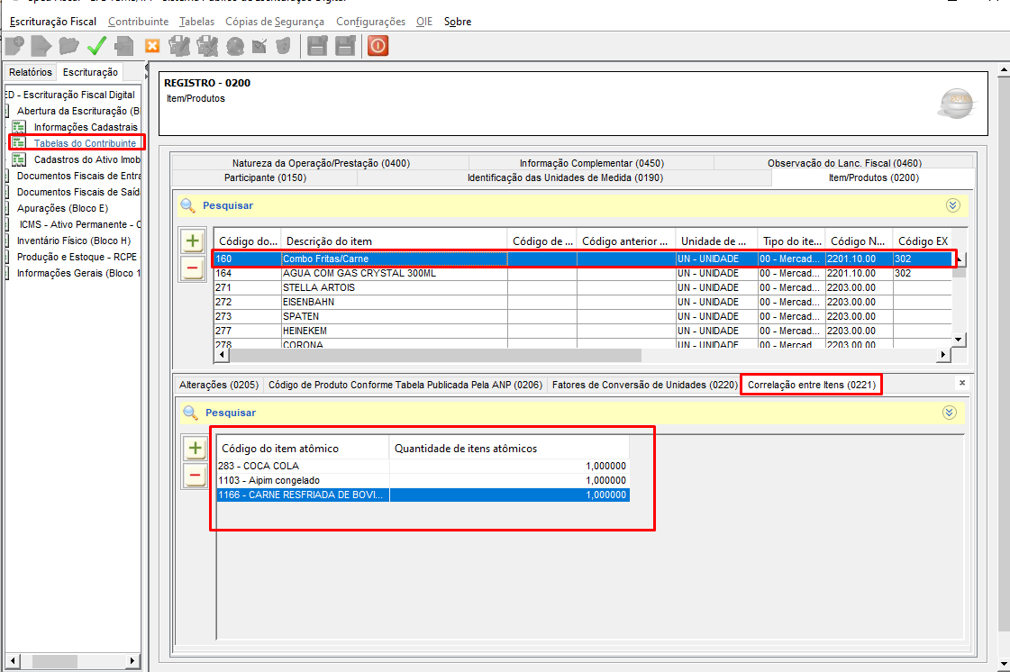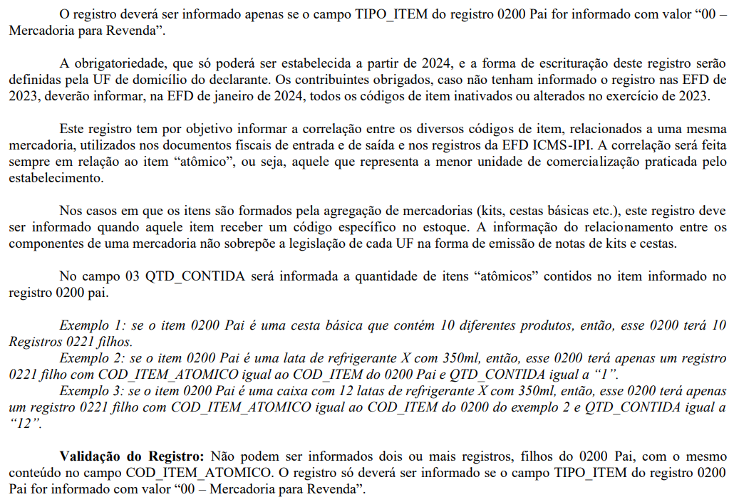 Exemplo 1: se o item 0200 Pai é uma cesta básica que contém 10 diferentes produtos, então, esse 0200 terá 10 Registros 0221 filhos.