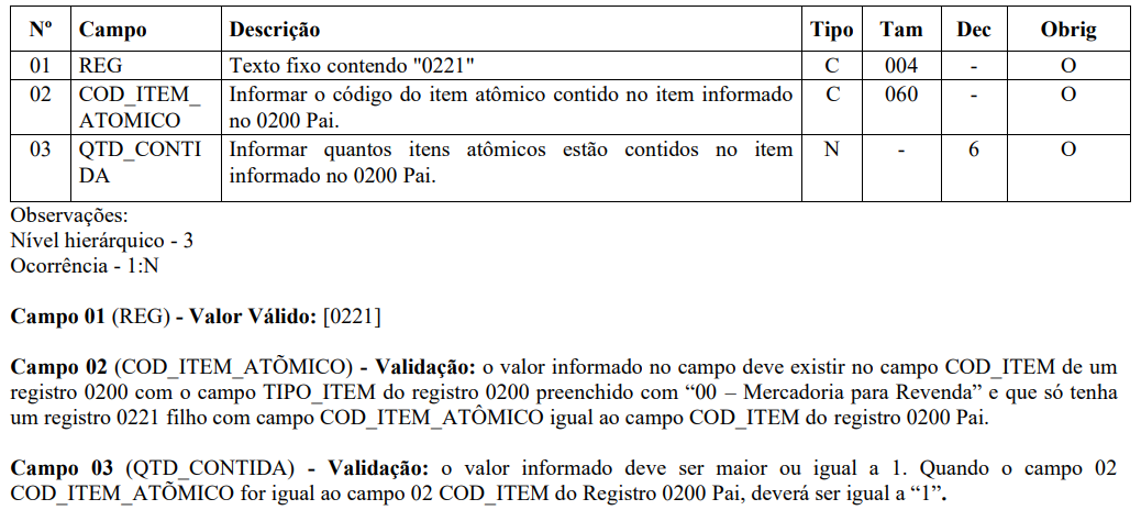 O registro deverá ser informado apenas se o campo TIPO_ITEM do registro 0200 Pai for informado com valor “00 – Mercadoria para Revenda”.