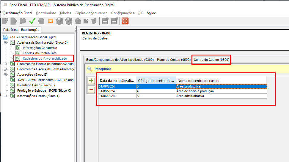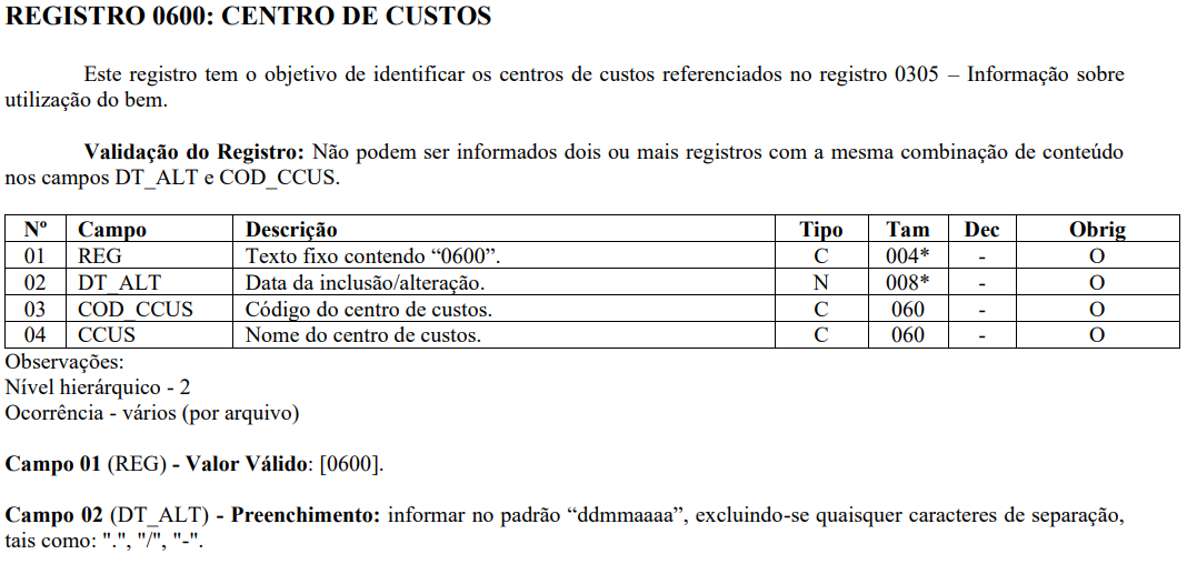 Este registro tem o objetivo de identificar os centros de custos referenciados no registro 0305 – Informação sobre utilização do bem.