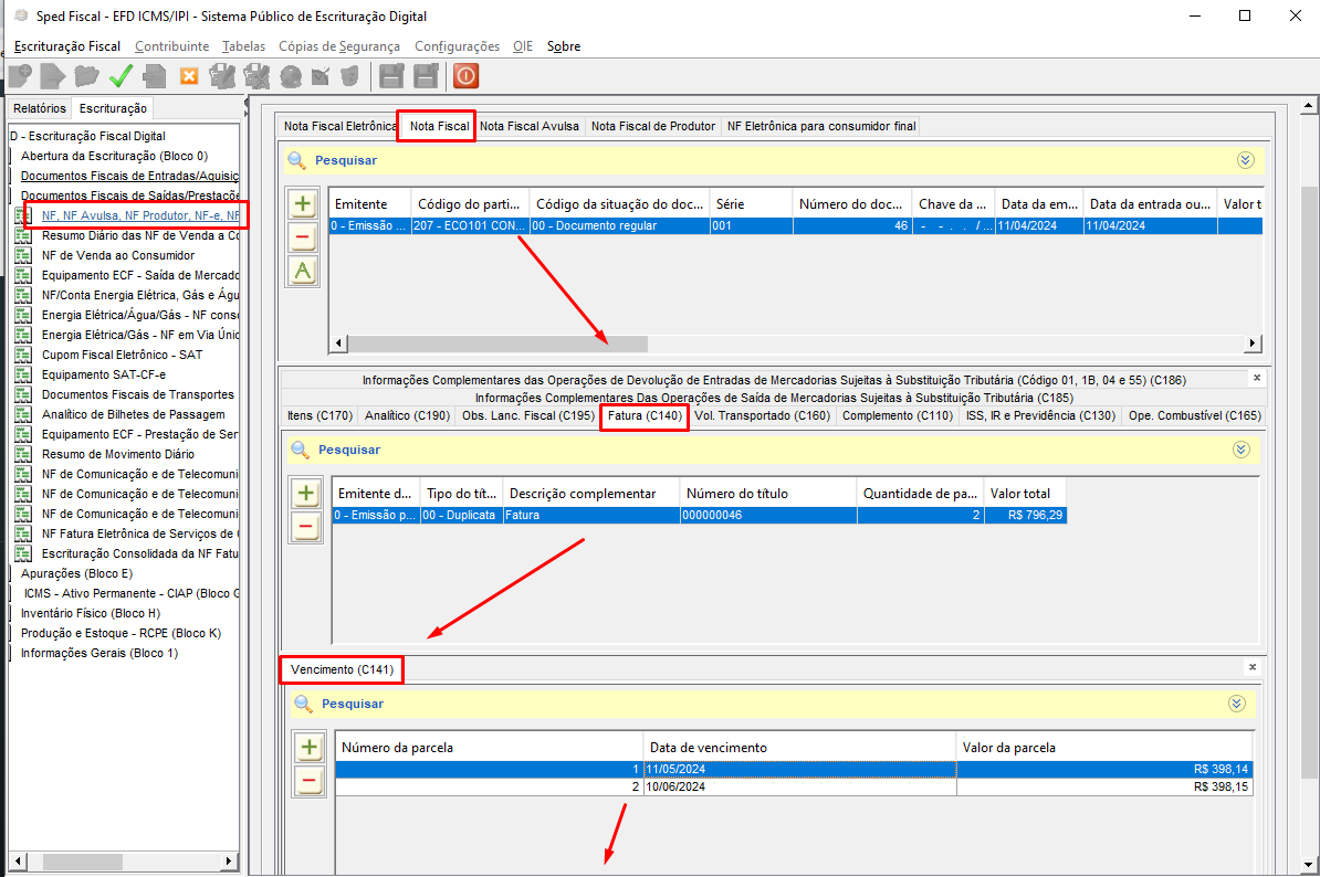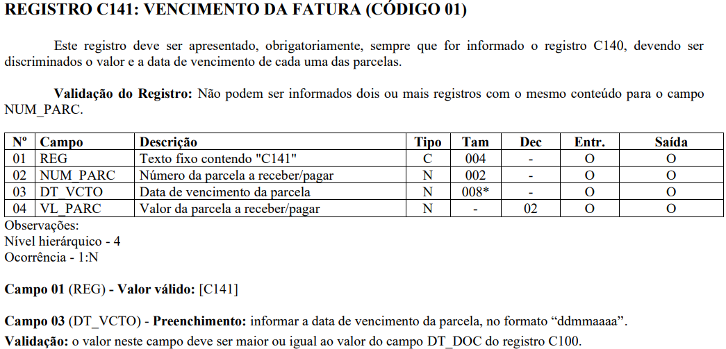 Este registro deve ser apresentado, obrigatoriamente, sempre que for informado o registro C140, devendo ser discriminados o valor e a data de vencimento de cada uma das parcelas.
