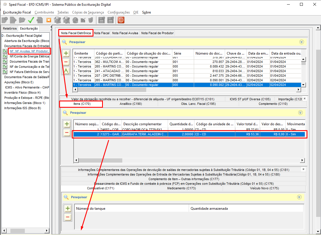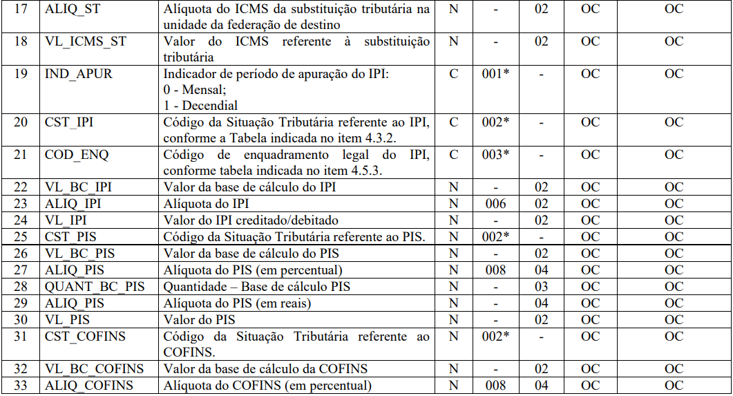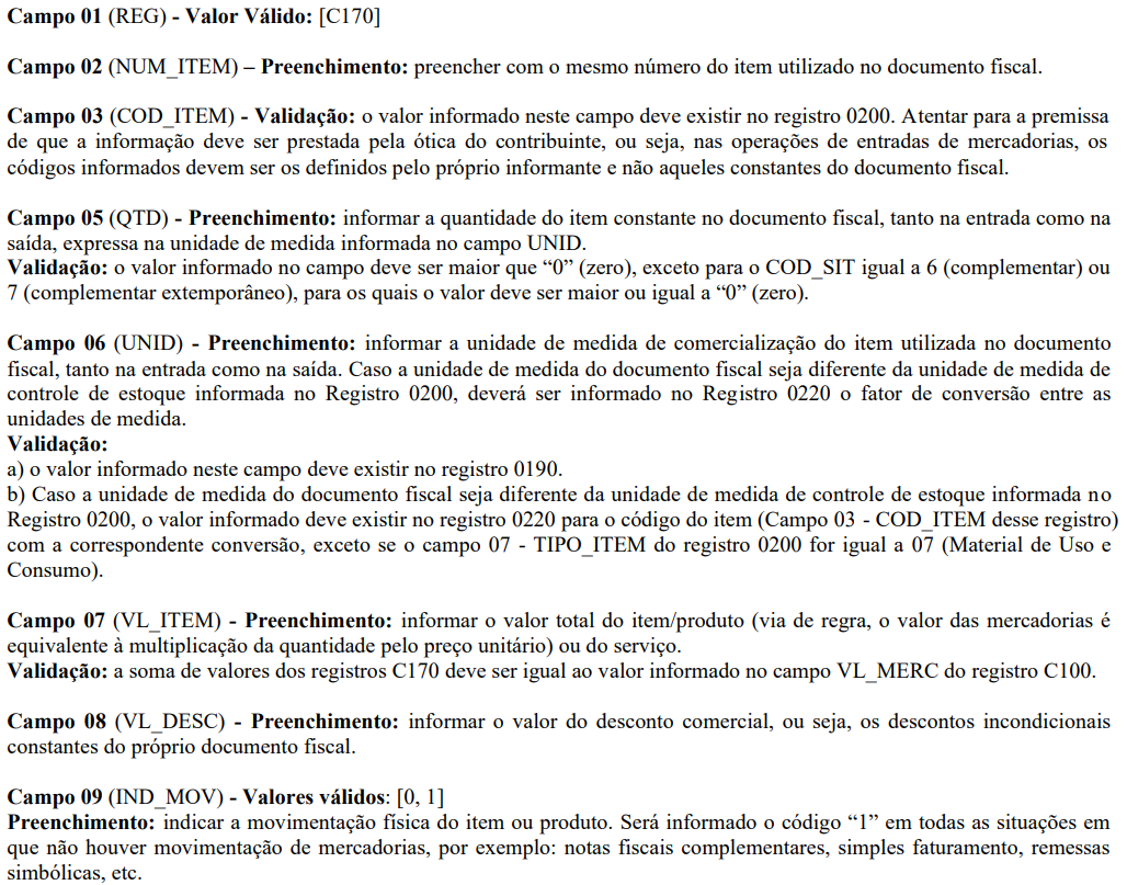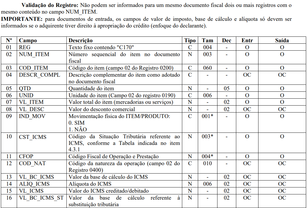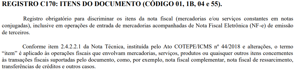 SPED FISCAL: Registro C170 - Complemento de Documento - Itens do Documento (código 01, 1B, 04 e 55)