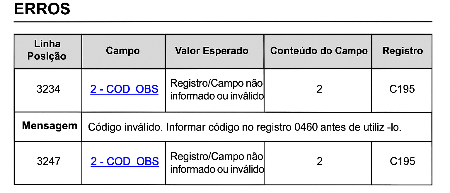 SPED FISCAL: Registro C195 - Código inválido. Informar código no registro 0460 antes de utilizá-lo.