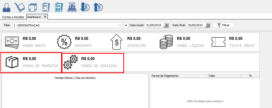 No Gerencial > Dashboard as vendas de serviços passam a ser exibidas de forma separada das vendas de produtos. Antes, os dois tipos eram contabilizados em conjunto, o que dificultava a análise detalhada das informações.