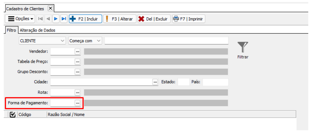 Foi adicionado na tela de manutenção de clientes um novo campo de filtro por forma de pagamento.