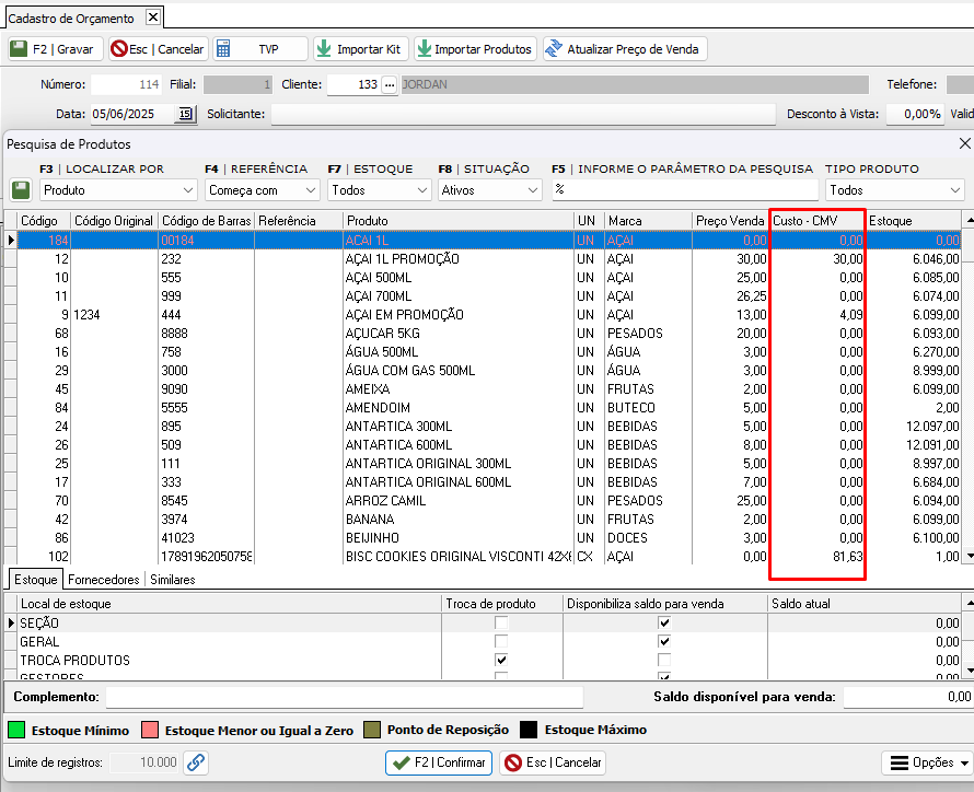 RELEASE.V37 Nova Coluna "Custo CMV" na Pesquisa de Produtos do Orçamento