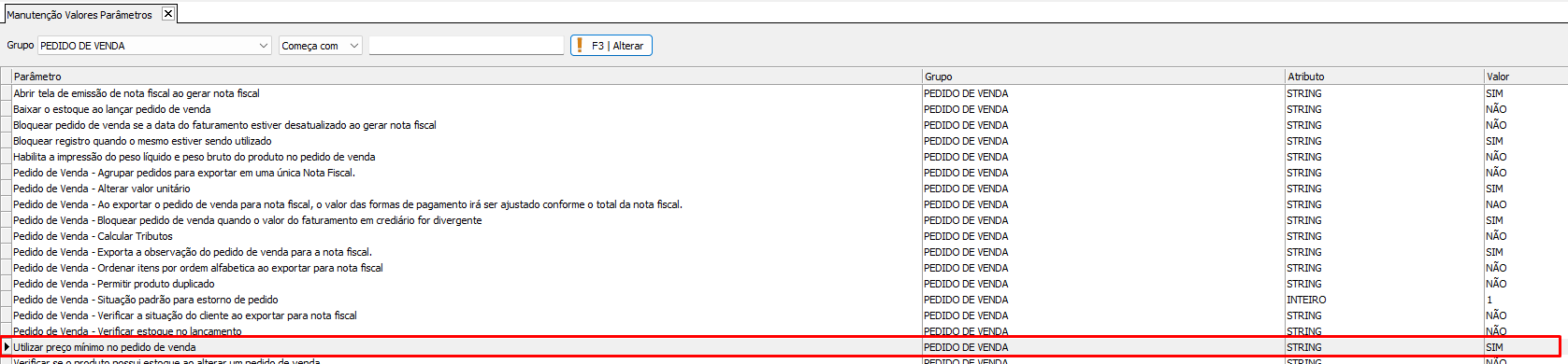 Para que a regra seja aplicada, é necessário acessar Parâmetros > parâmetro valor > "Pedido de Venda → Utilizar preço mínimo no pedido de venda" como SIM.