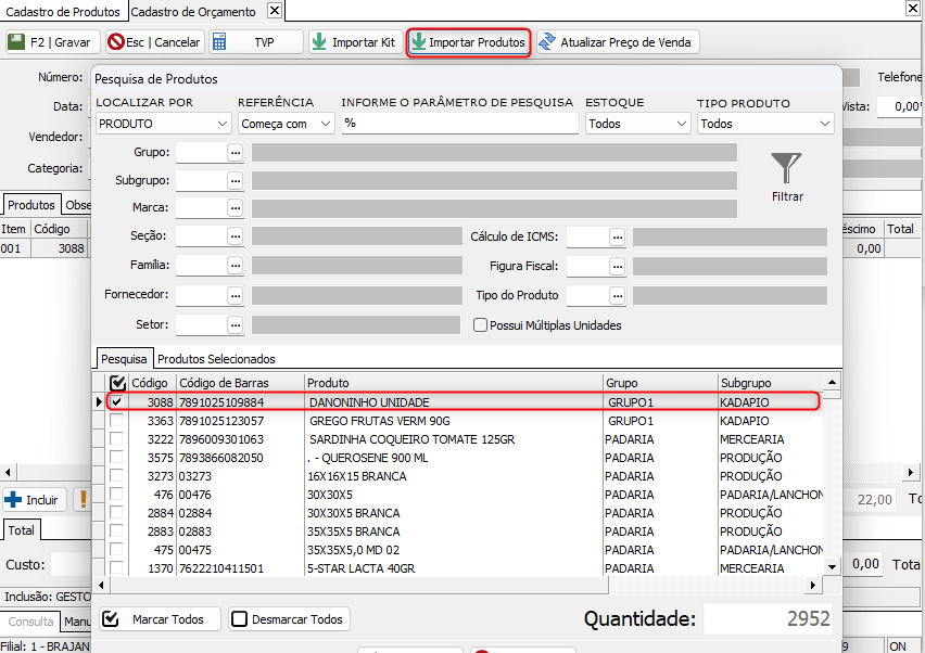 Foi adicionado o botão 'Importar Produtos' para facilitar a inserção de itens diretamente no orçamento a partir de cadastros existentes